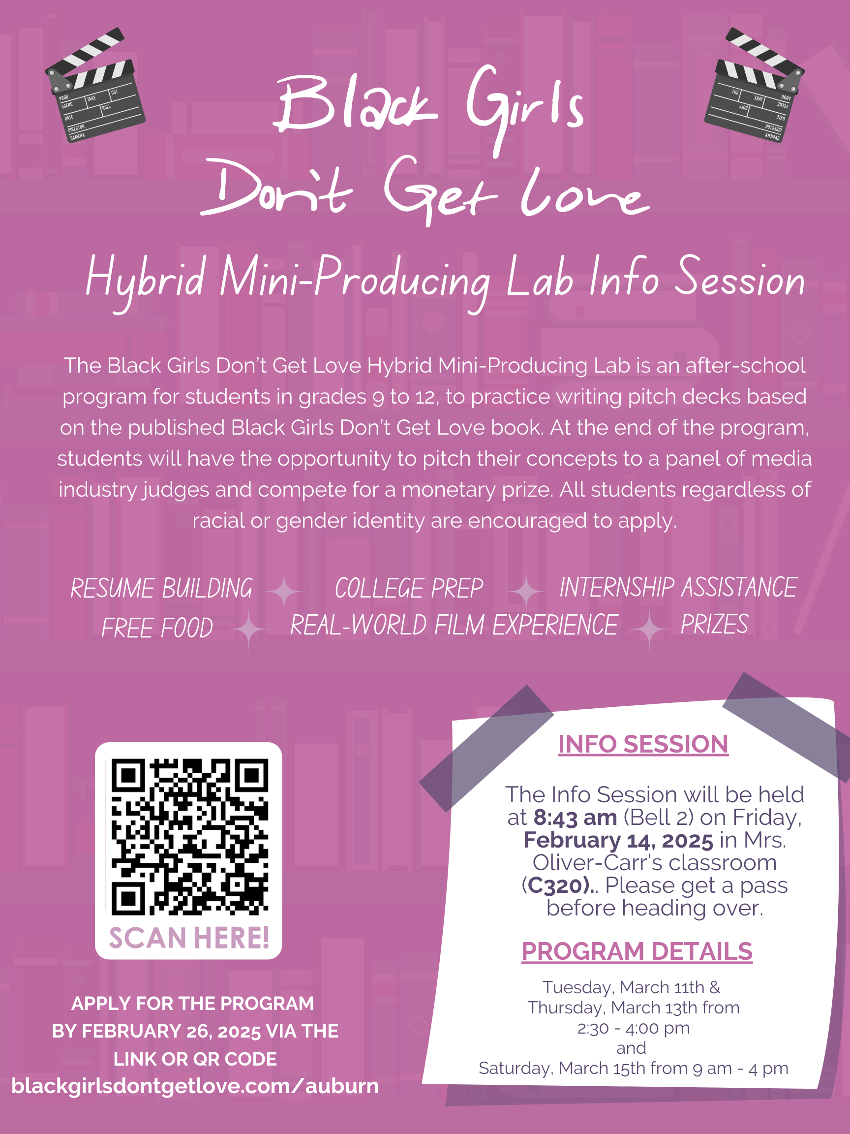 The Black Girls Don’t Get Love Hybrid Mini-Producing Lab is an after-school program for students in grades 9 to 12, to practice writing pitch decks based on the published Black Girls Don’t Get Love book. At the end of the program, students will have the opportunity to pitch their concepts to a panel of media industry judges and compete for a monetary prize. Please apply for the program using the link below!