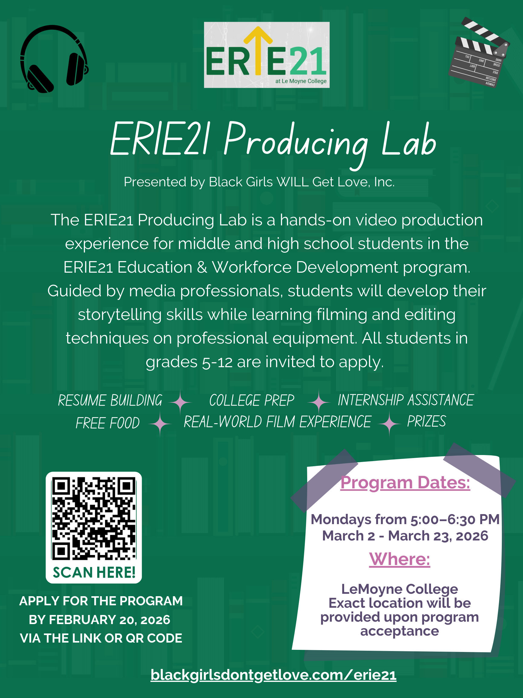 The ERIE21 Producing Lab will be hosted at LeMoyne College on Mondays from 5:00–6:30 PM starting March 2nd through March 23rd of 2026. Please email info@blackgirlsdontgetlove.com with any questions.