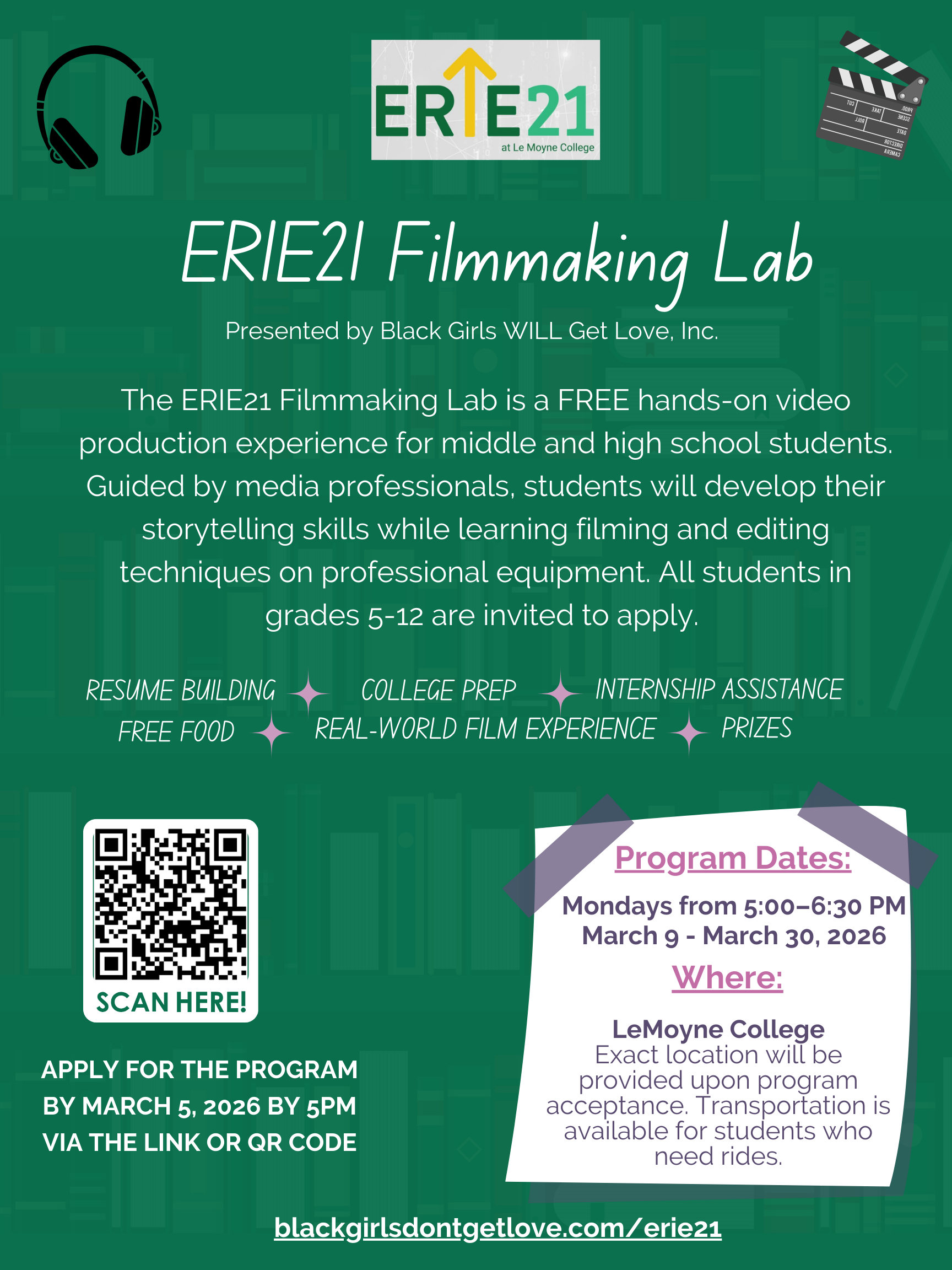 The ERIE21 Producing Lab will be hosted at LeMoyne College on Mondays from 5:00–6:30 PM starting March 9th through March 30th of 2026. Please email info@blackgirlsdontgetlove.com with any questions.